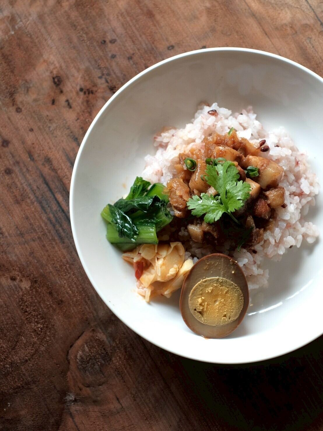 甘辛く煮た豚肉が白いご飯と絡み合い、五香スパイスがさらに旨味を引き立たせる。