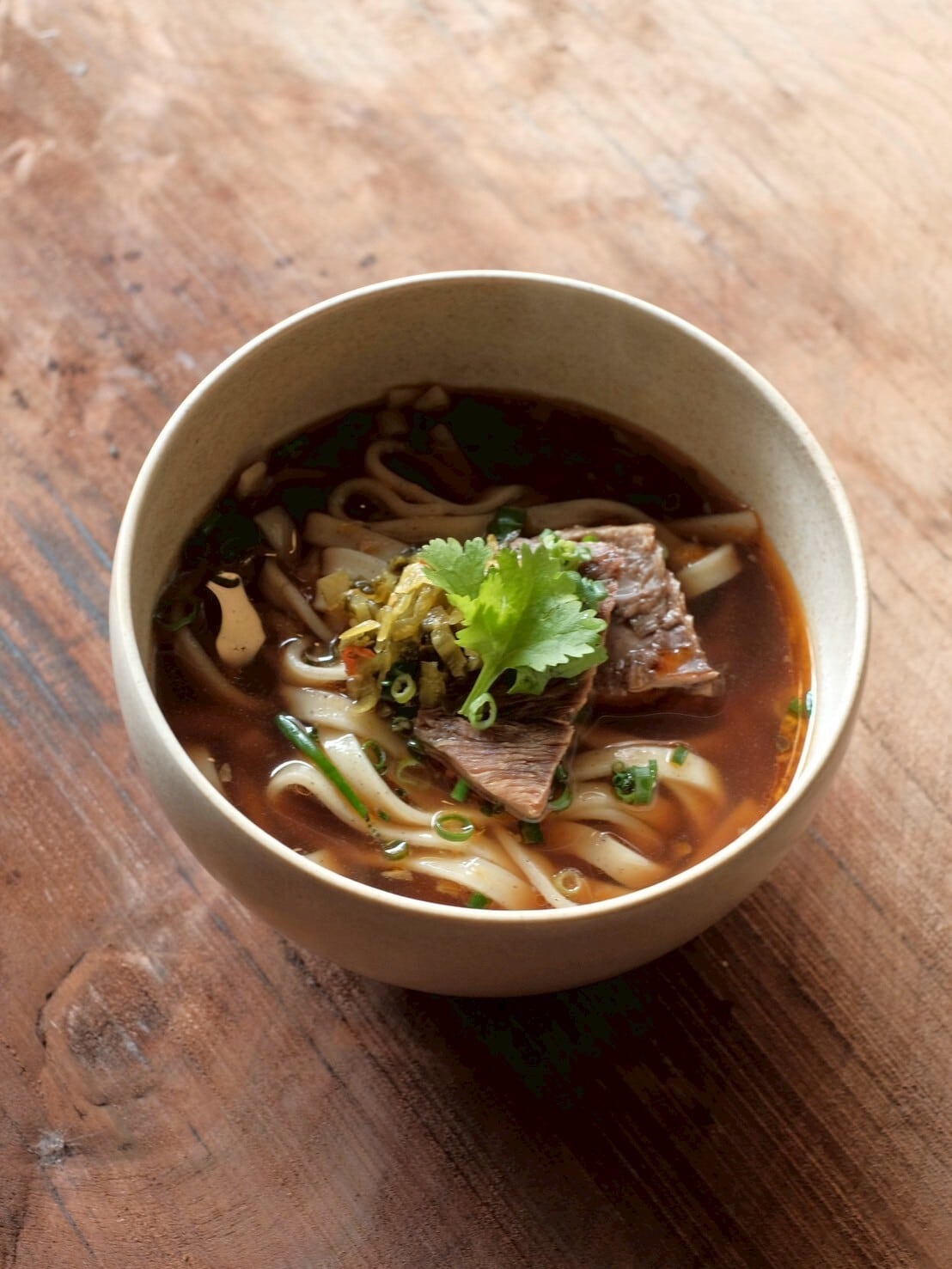 旨味たっぷりの牛肉スープ、ホロホロに煮込んだ牛肉、こだわりの自家製平打ち麺が